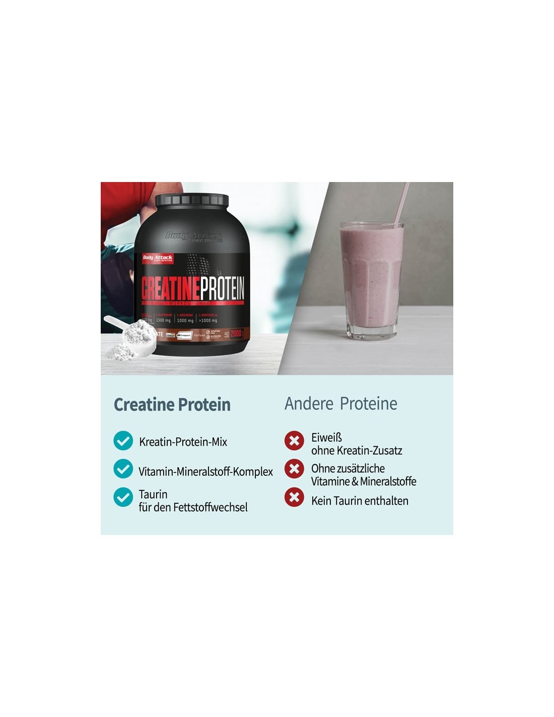 A shake with the Body Attack Creatine protein also provides other important nutrients for the mass-building phase and for muscle growth: