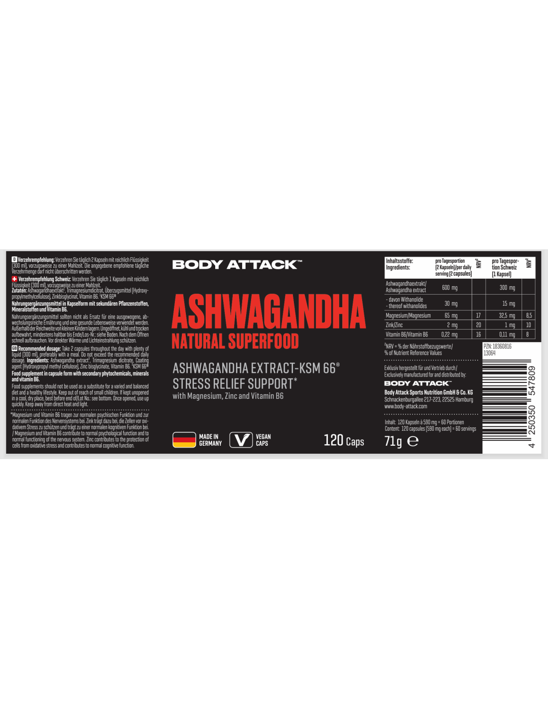Discover the secret of your best performance with the BODY ATTACK ASHWAGANDHA capsules! We know how important it is to get the most out of your training while ensuring your well-being at the same time. With these capsules, we support you on your way to achieving your goals and reaching your full potential. Ashwagandha, the Indian ginseng, is a true superfood that strengthens not only your body but also your mind.