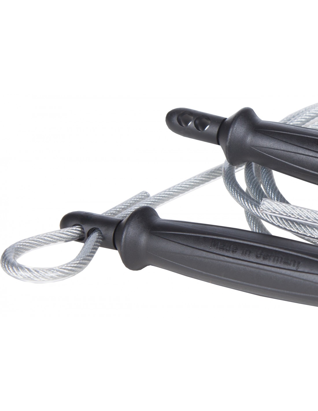 The heavy, 6 mm thick, plastic-coated steel rope allows high rotation frequencies and is part of the standard equipment of every martial artist. The patented rope holder allows the rope length to be adjusted to any body size. Ergonomically moulded plastic handles provide a firm grip. Weights, which can be ordered separately, fit into the handles to increase the training effect.