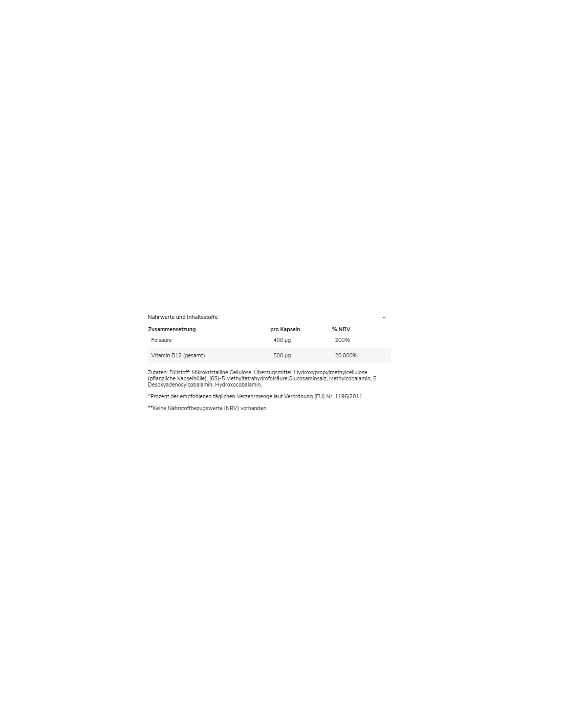 Zutaten: Füllstoff: Mikrokristalline Cellulose, Überzugsmittel: Hydroxypropylmethylcellulose (pflanzliche Kapselhülle), (6S)-5 Methyltetrahydrofolsäure,Glucosaminsalz, Methylcobalamin, 5 Desoxyadenosylcobalamin, Hydroxocobalamin.