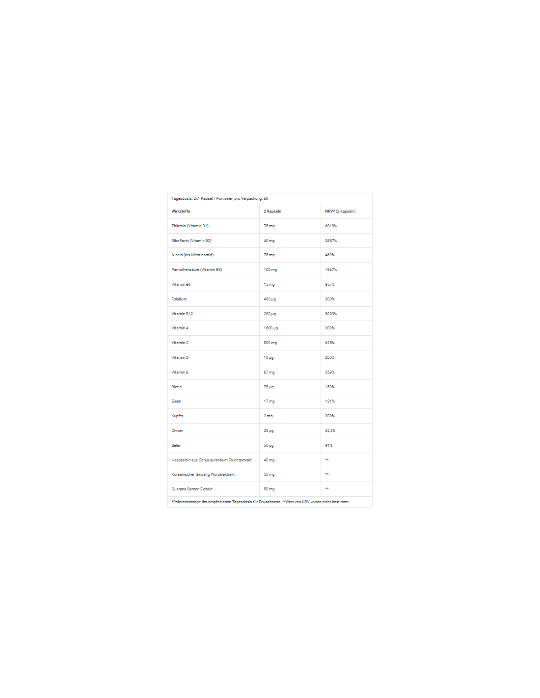 L-Ascorbinsäure, Kapselhülle [Gelatine, Überzugmittel (Schellack), Farbstoff (Eisenoxide und -hydroxide), Säureregulator (Ammoniumhydroxid, Kaliumhydroxid)], DL-αTocopherylacetat [DL-α-Tocopherylacetat, Trennmittel (Siliciumdioxid)], Füllstoff (Cellulose-Gel), Calcium-D-pantothenat, Guarana Extrakt-Zubereitung [Guarana (Paullinia cupana) Samenextrakt, Koffein], Thiaminmononitrat, Nicotinamid, Eisen(II)-fumarat, Koreanischer Ginseng (Panax ginseng) Wurzelextrakt, Hesperidin (aus Citrus aurantium Fruchtextrakt), Riboflavin [Riboflavin, Füllstoff (Hydroxypropylmethylcellulose)], Trennmittel (Magnesiumsalze der Speisefettsäuren, Siliciumdioxid), Cyanocobalamin, Retinylacetat [Stabilisator (Gummi arabicum), Retinylacetat, Antioxidationsmittel (Alpha-Tocopherol), Trennmittel (Calciumphosphate)], Pyridoxinhydrochlorid, Kupfergluconat, Natriumselenit, Cholecalciferol, Calcium-L-methylfolat, Chrom(III)-chlorid, D-Biotin.