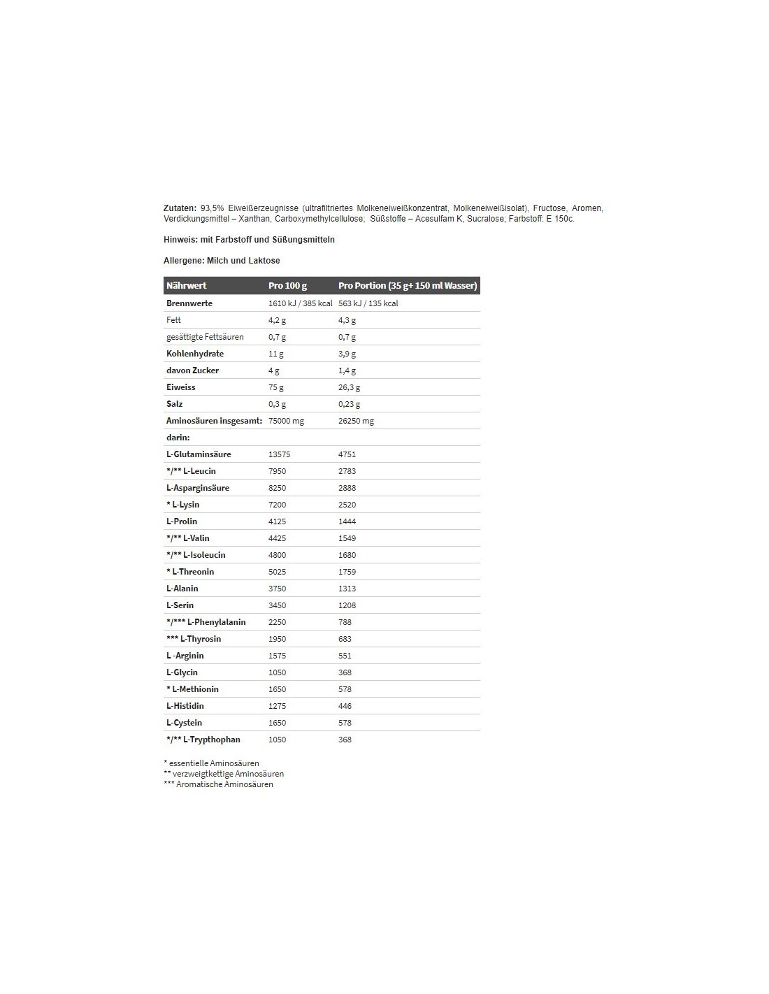 Zutaten: 95% Eiweißerzeugnisse (Molkeneiweißkonzentrat (aus Milch), Molkeneiweißisolat (aus Milch)), Aromen, Erdnuss mehl (für Peanut Butter Geschmack), Säureregulatoren Citronensäure, Natriumcitrate; Verdickungsmittel Gummi arabicum, Xanthan, Natrium-Carboxymethylcellulose; Süßungsmittel Acesulfam K, Sucralose; Emulgator Lecithine (aus Soja); Salz, Farbstoffe: Carotin (A), Echtes Karmin (B), Riboflavine (C), E 150c (D), E 150d (E), E 133 (F).