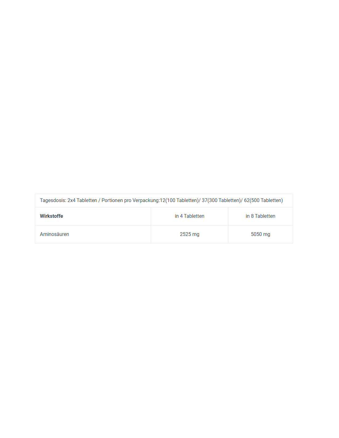 - Füllstoff (Cellulose-Gel), Glutaminpeptid (enthält Weizen), Sojaproteinisolat, Erbsenproteinisolat, Überzug (Stabilisatoren (Polyvinyl alcohol-polyethylene glycol-graft-co-polymer, Polyvinylalkohol), Trennmittel (Talkum, Mono- und Diglyceride von Speisefettsäuren)), Instant-L-Leucin (L-Leucin, Emulgator: Lecithin, Maltodextrin), L-Glutamin, Trennmittel (Magnesiumsalze der Speisefettsäuren, Siliciumdioxid), L-Isoleucin, L-Valin.