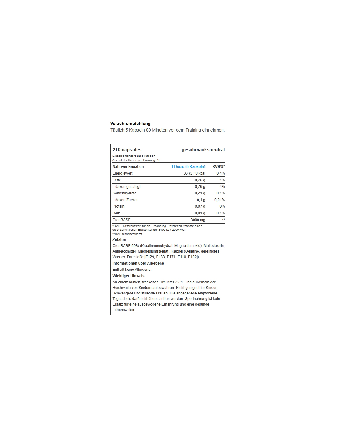 - CreaBASE 69% (Kreatin-Monohydrat, Magnesiumoxid), Trennmittel (Magnesiumsalze der Speisefettsäuren), Kapselhülle [Gelatine, Überzugmittel (Schellack), Farbstoff (Eisenoxide und -hydroxide), Säureregulator (Ammoniumhydroxid), Säureregulator (Kaliumhydroxid)], Maltodextrin.