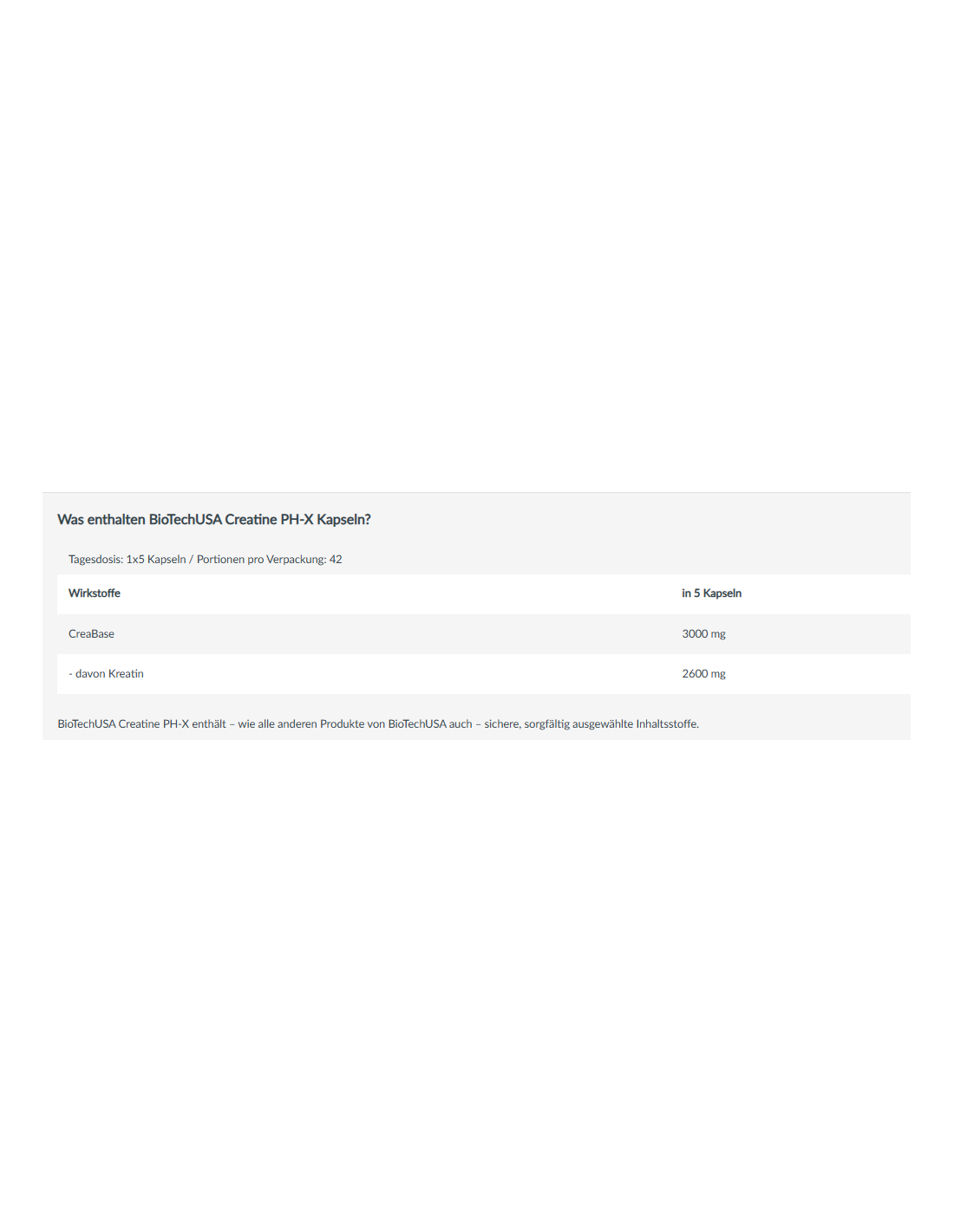 La particolarità di queste capsule è il buffering della creatina, che la protegge dalla scomposizione nel prodotto di degradazione creatinina. BioTech USA Creatine PH-X è stabile al pH e garantisce un assorbimento ottimale nel corpo. Questa tecnologia è già nota da Kre Alkalyn. Rispetto a Kre Alkalyn, BioTech USA Creatine PH-X è significativamente più economica. A proposito, non è necessaria una fase di caricamento.