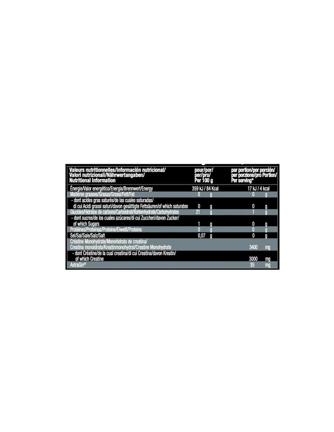 -Miscela di 10 varietà dicreatina -Aiuta a massimizzare le prestazioni e la forza in pochissimo tempo -Partecipa alla formazione dell'adenosina trifosfato (ATP) -aumenta le prestazioni fisiche -Aumenta la velocità del lavoro muscolare -Migliora la rigenerazione -Con taurina, fieno greco, betaina, L-ornitina, L-citrulina, L-argina...