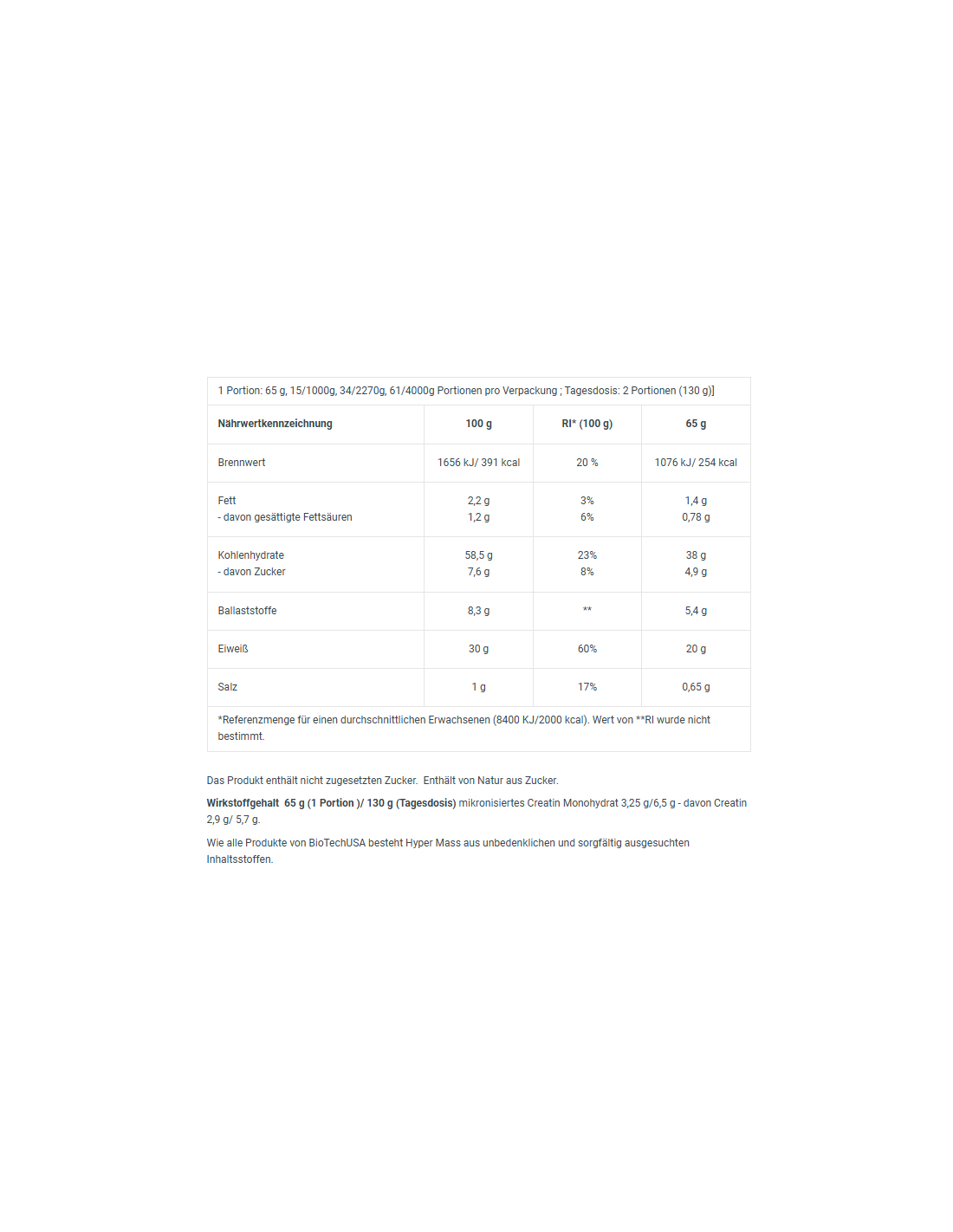 Hyper Mass è un prodotto per l'aumento di peso di una classe a sé stante! Questa bevanda per l'aumento di massa contiene tutto ciò di cui hai bisogno per costruire muscoli e per un allenamento potente con carboidrati, proteine e creatina.