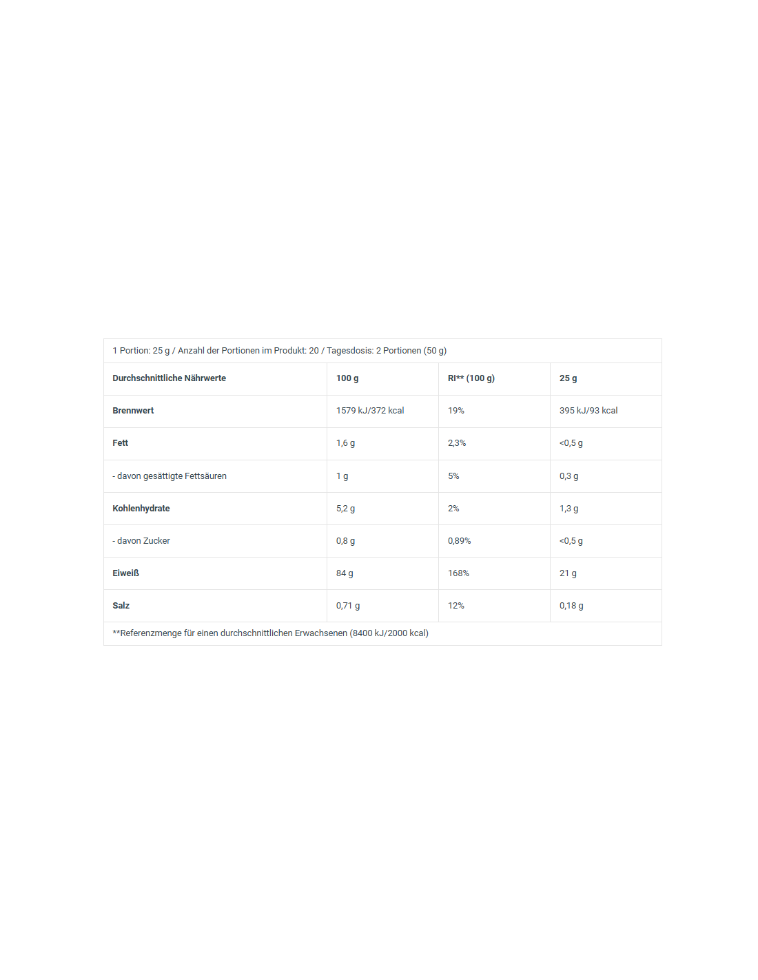 Molkenproteinisolat 87% [Molkenproteinisolat, Emulgator: Lecithine (Soja)], Kokosfett-Zubereitung [teilweise gehärtetes Kokosfett, Magermilchpulver, Emulgatoren (E471, E472a), Glukosesirup, Saccharose, Milcheiweiß, Stabilisator (Kaliumphosphate), Trennmittel (Calciumphosphate)], L-Glutamin 2.5%, Aromen, Emulgator: Lecithine (Soja), Verdickungsmittel (Carrageen, Xanthan), Speisesalz, Säuerungsmittel (Citronensäure), Trennmittel (Siliciumdioxid), L-Leucin 0.2%, Süßungsmittel (Sucralose), L-Isoleucin 0.1%, L-Valin 0.1%.