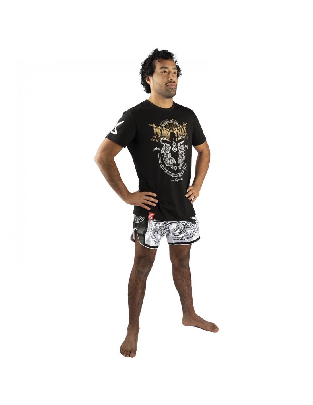 I Sak Yant sono tatuaggi tradizionali thailandesi e si dice che proteggano chi li indossa dalla sfortuna, dalla cattiva sorte e dalle influenze negative. Si dice che gli yant abbiano una serie di effetti positivi sulla vita. Gli yant raggiungono il loro massimo effetto quando vengono incisi durante una cerimonia e consacrati dal maestro del tatuaggio. Molti combattenti di Muay Thai indossano questi tatuaggi per proteggersi dalle ferite e per acquisire forza. Le tigri sono il motivo più spesso indossato dai Nak Muay e conferiscono a chi le indossa una grande forza. T-shirt dal taglio atletico con numerose stampe sul davanti, sul collo e sulle maniche.