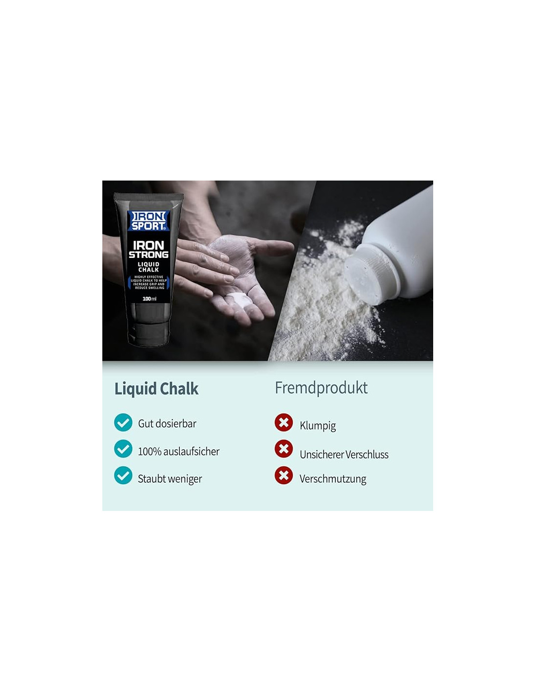 Con IronSport Liquid Chalk puoi migliorare la forza della tua presa e concentrarti completamente sul tuo allenamento. Niente più macchie di gesso sui tuoi vestiti, ora puoi concentrarti completamente sui tuoi obiettivi sportivi!