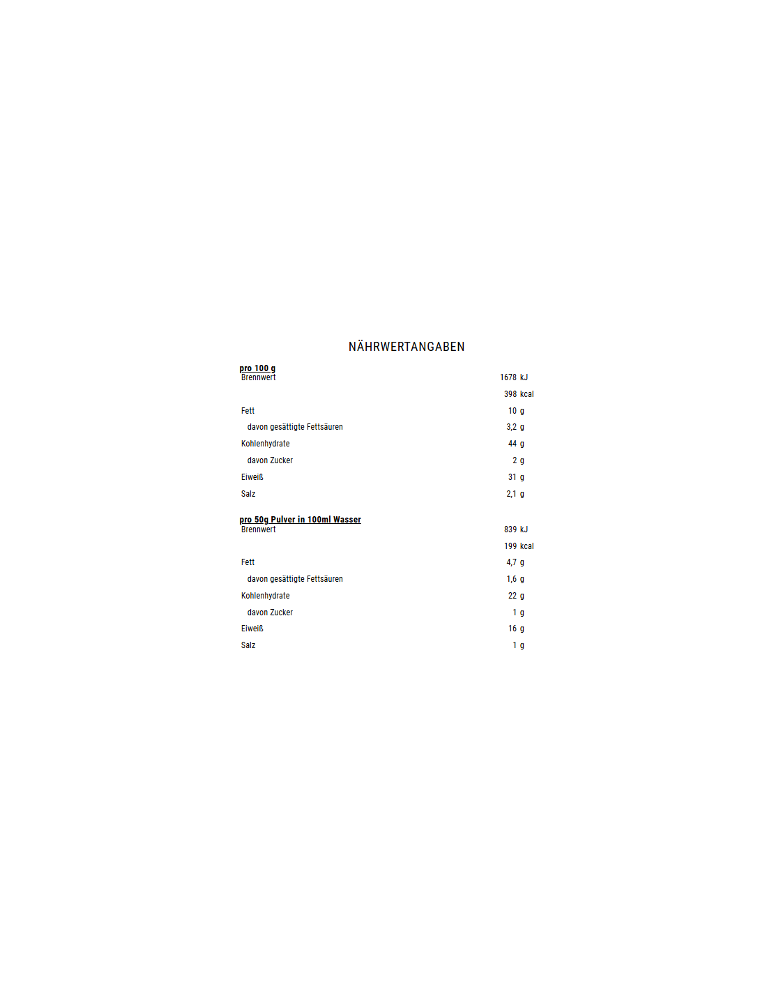 - : 51% Hafermehl, 16% Molkenproteinkonzentrat, 10% Volleipulver, Eiersatz (Weizenmehl, Molkenproteinkonzentrat, modifizierte Stärke), 4 % Milchproteinisolat, 2,5% Hühnereiweiß, 2% Getreidemischung (Haferkleie, Quinoa, Amaranth, Buchweizen, Hirse), Emulgator: Lecithine; Backtriebmittel: Dinatriumdiphosphat, Natriumcarbonat; angereichertes Weizenmehl (Weizenmehl, Calciumcarbonat, Eisen, Niacin (Vitamin B3), Thiamin (Vitamin B1)), Aroma, Natriumchlorid, Verdickungsmittel: Guarkernmehl, Xanthan; Süßungsmittel: Acesulfam K, Sucralose.