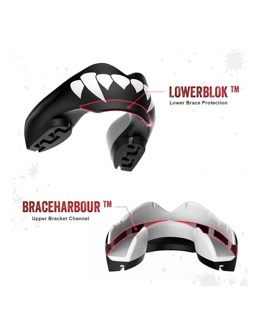 La nostra Serie Ortho è il paradenti più avanzato sul mercato, appositamente progettato per le persone con apparecchi ortodontici. Grazie al nostro BRACE HARBOUR™ brevettato, offre una protezione completa per l'apparecchio ortodontico superiore. Ma non solo: il nostro paradenti integra anche il LOWERBLOK™ per proteggere le labbra e l'interno della guancia dai brackets inferiori (se presenti).