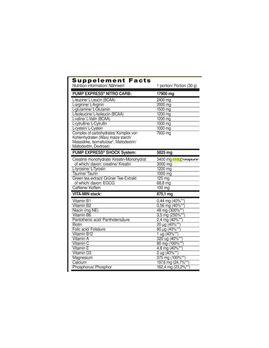 Con PUMP EXPRESS® NITRO CARB ottieni una combinazione di aminoacidi puri e carboidrati, fondamentali durante gli sforzi intensi. I vari livelli di zucchero nel sangue forniscono l'energia di cui hai bisogno per portare il tuo allenamento a un livello superiore.