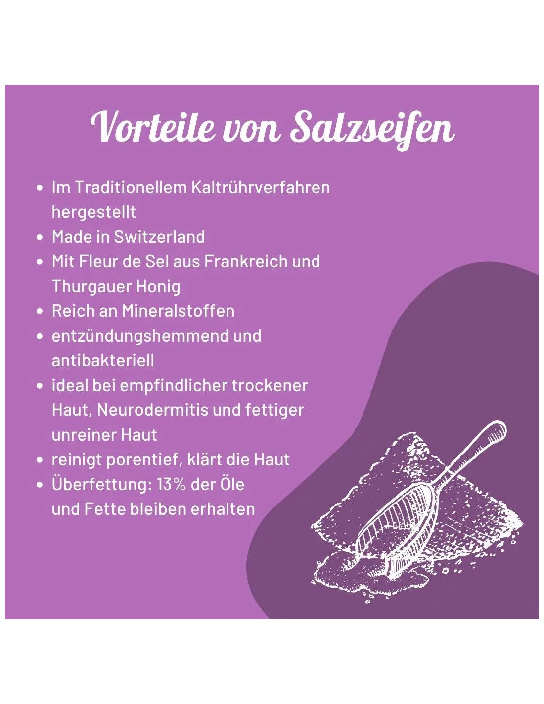Questo sapone al sale lavorato a freddo è particolarmente adatto alle pelli sensibili. Grazie agli oli e ai grassi di alta qualità, crea una schiuma piacevolmente cremosa nonostante l'elevato contenuto di sale. L'elevato contenuto di grassi del 13% e il miele che contiene nutrono intensamente la pelle e aiutano a mantenere la sua naturale idratazione.