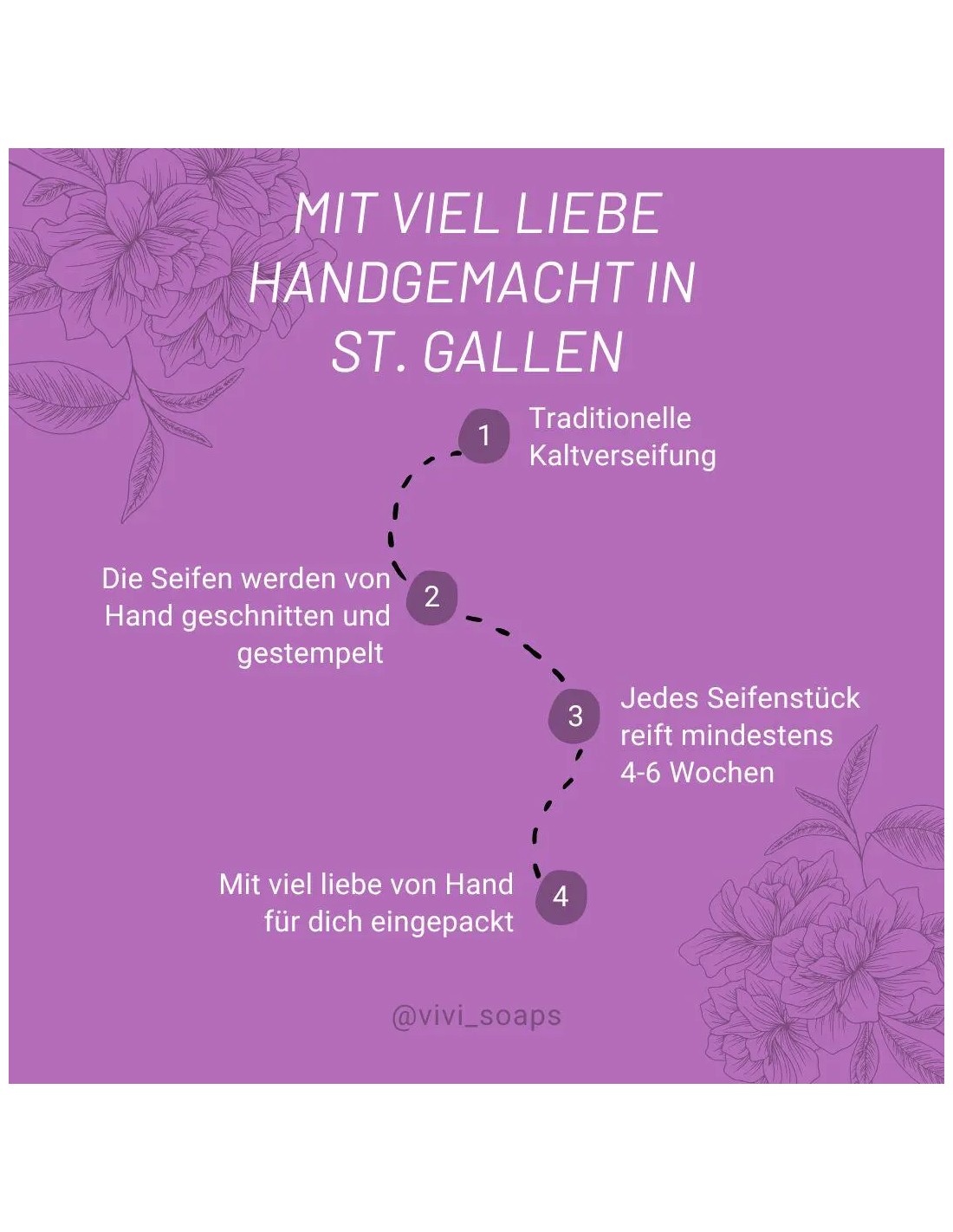 Tutti i prodotti sono realizzati a mano da me in piccolissimi lotti nel mio studio a San Gallo, in Svizzera. I miei saponi sono realizzati con il metodo a freddo, che mi dà il controllo completo su ogni singolo ingrediente. Ogni saponetta viene lasciata indurire per 4-6 settimane per consentire all'acqua in eccesso di evaporare, ottenendo un sapone particolarmente duro e duraturo.